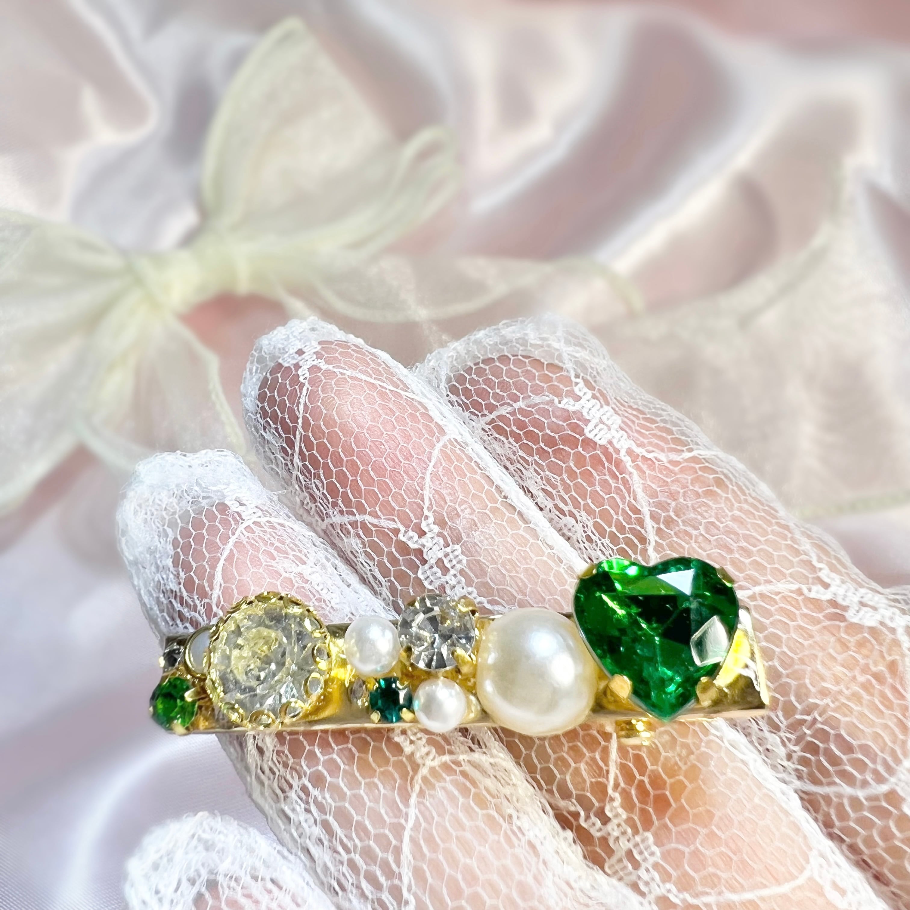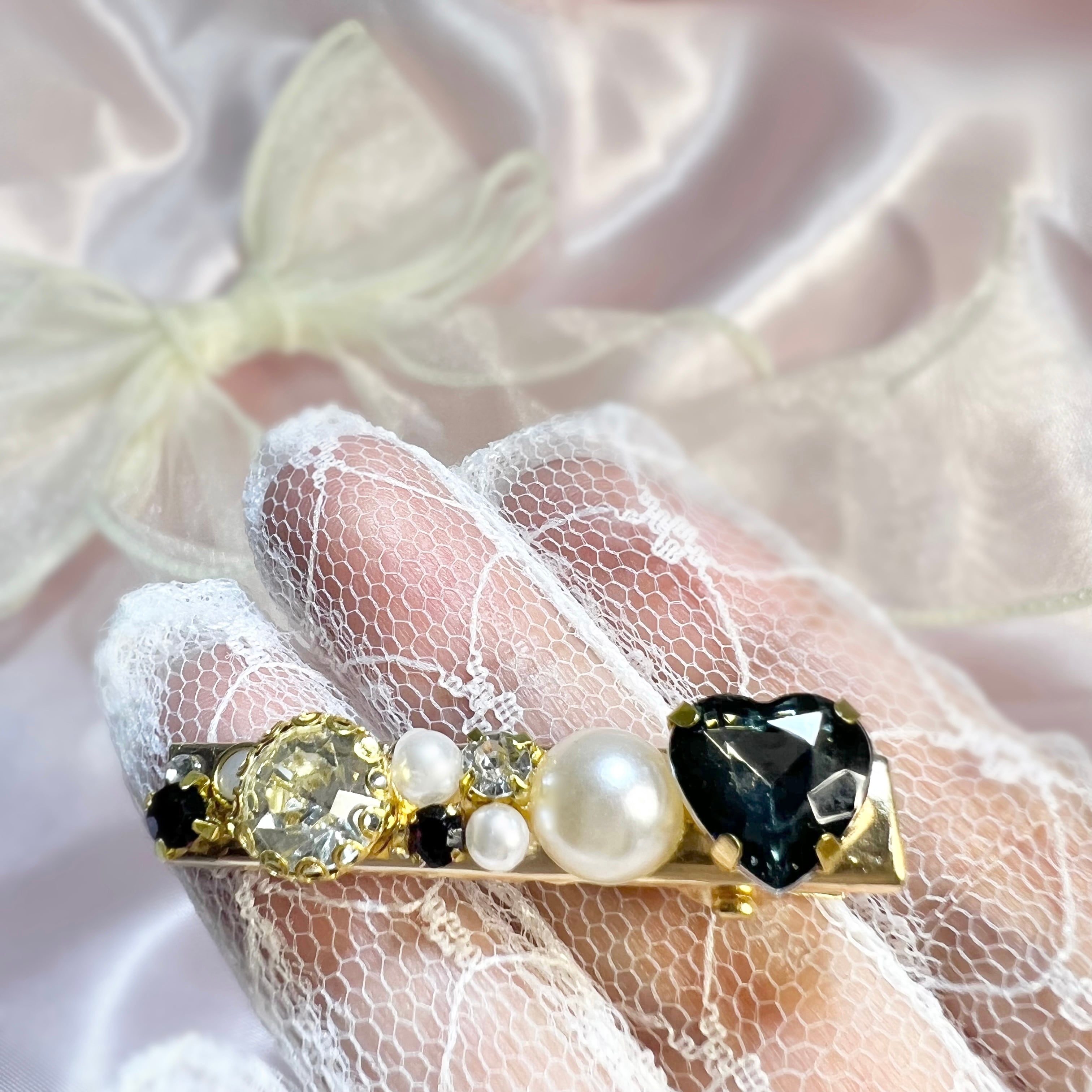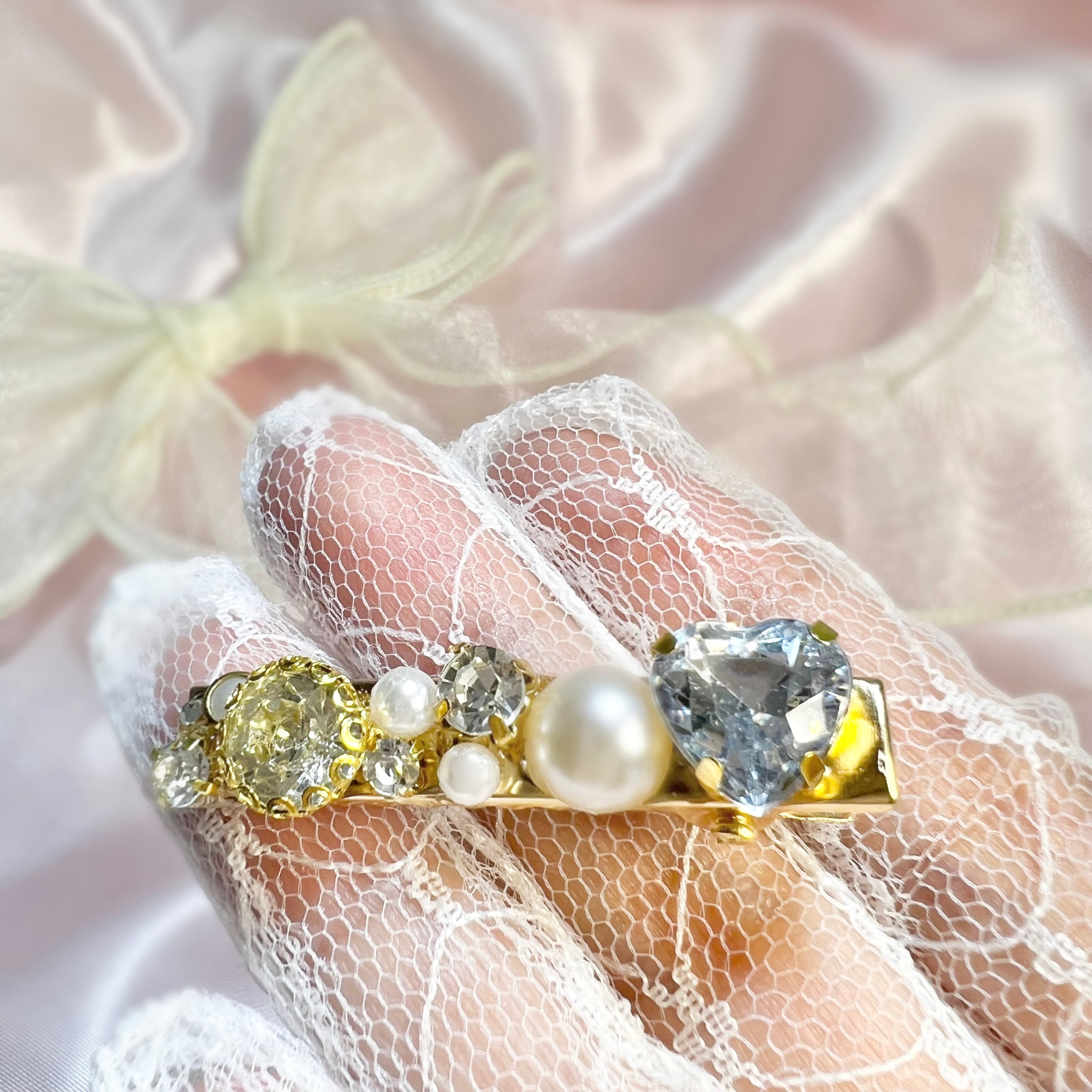 大小のパールやキラキラと輝くビジューなどを